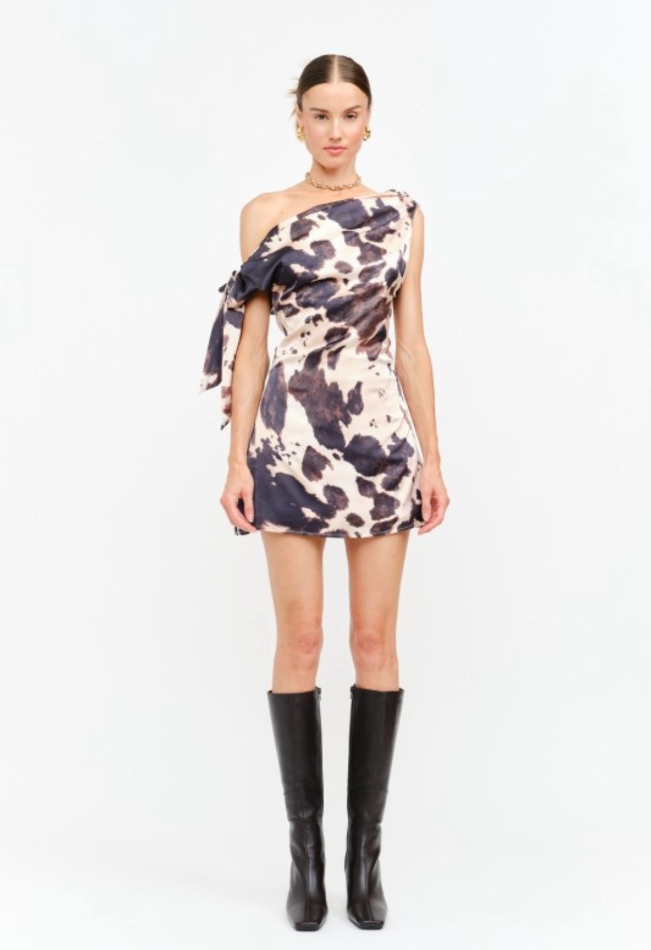 One shoulder cow printed dress. Runs true to size.